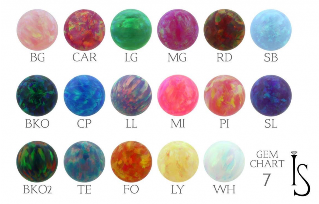 la couleur de l’opale : LG, MG, RD, BKO, CP, SL, BKO2, WH